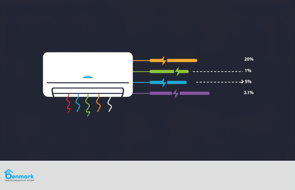 Moderne Inverter-Splitklimaanlagen kühlen in Oldenburg mit überraschend wenig Strom: je nach Gebäude, Nutzung und Gerät etwa 90–300 kWh pro Sommer bzw. rund 29–80 € bei 0,32–0,40 €/kWh; im Heizbetrieb überzeugen sie als Luft/Luft-Wärmepumpe mit SCOP um 4. Welche Last wirklich anfällt, bestimmen Dämmstandard, Ausrichtung, Luftfeuchte und Solltemperatur – mit richtiger Auslegung, Sonnenschutz, smarten Einstellungen, Wartung und PV-Kopplung senken wir als benmark Gebäudetechnik GmbH Ihren Verbrauch nachhaltig.